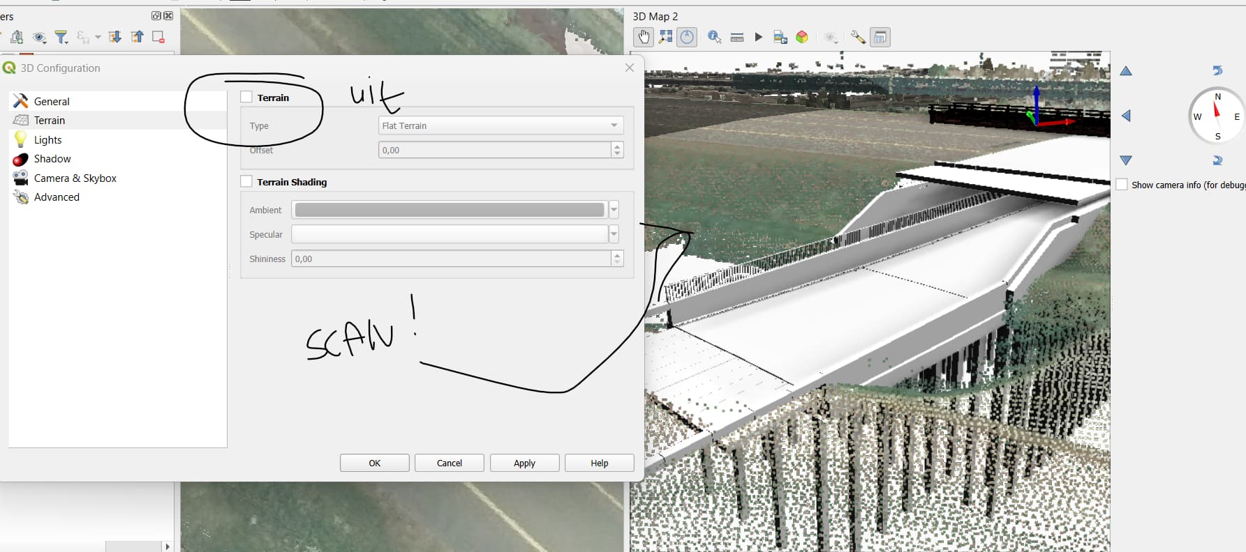 Ik ben er achter! Als je ‘terrrain’ uitzet. Dan kun je geen fotomateriaal gebruiken maar wel scandata. Past ook beter met 3D.