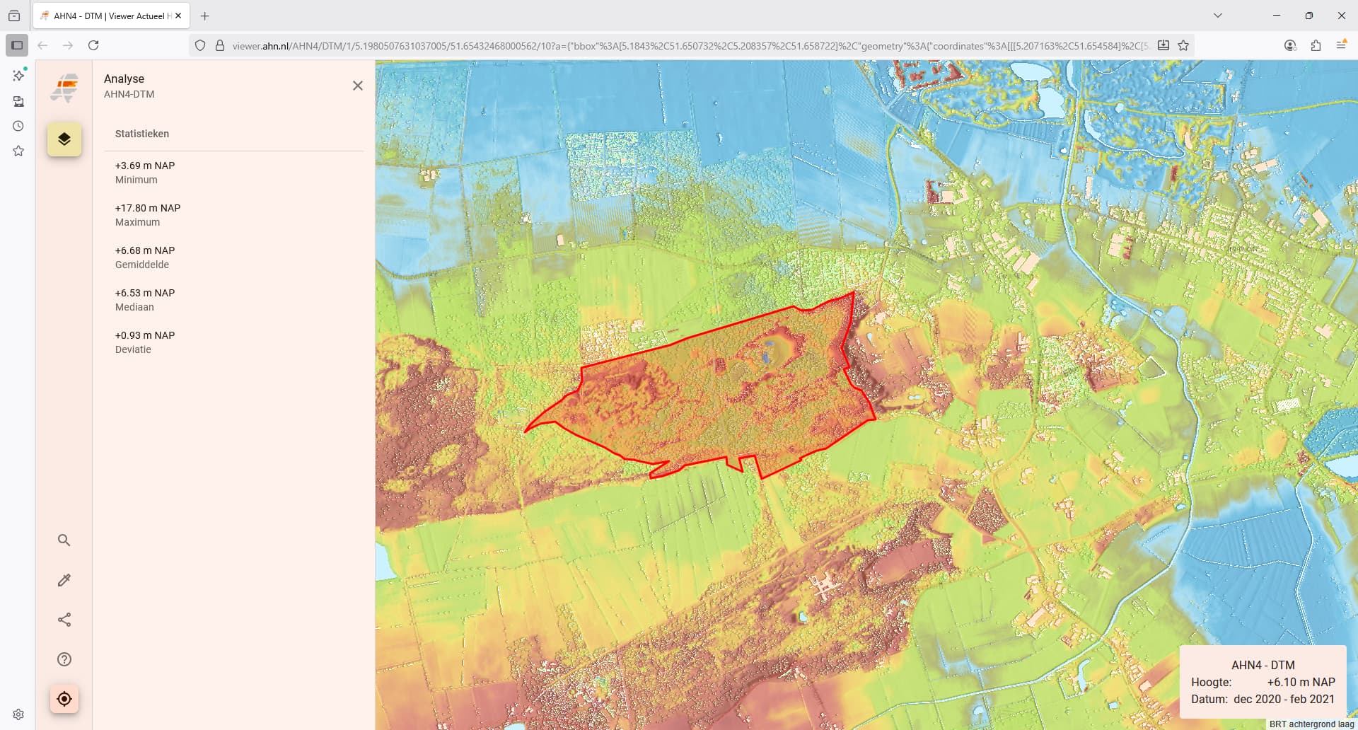 In de AHN Viewer zit leuke functionaliteit om een snelle hoogteanalyse voor een vlak uit te voeren. Je tekent een polygoon op de kaart, en de AHN Viewer toont een aantal waarden: de maximale, de minimale en de gemiddelde hoogte, en de mediaan en de deviatie, in meters ten opzichte van NAP.