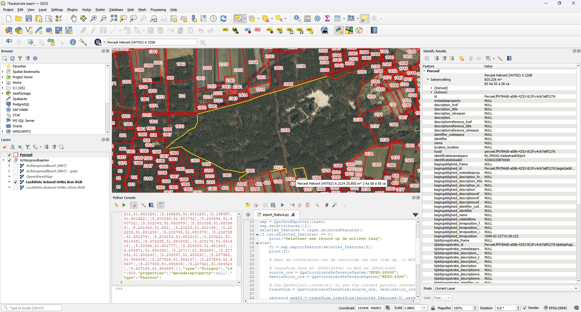 Hieronder - zie de schermafdrukken - proberen we het met een perceel uit de kadastrale kaart, Perceel Helvoirt (HVT02) A 2208 met een oppervlakte van 82 ha 52 a 26 ca. Let op: voor dit script is niet zozeer de oppervlakte van het perceel, als wel de complexiteit van de geometrie van belang. Het aantal nodes bepaalt immers de lengte van de GeoJSON-string, en daarmee van de URL.