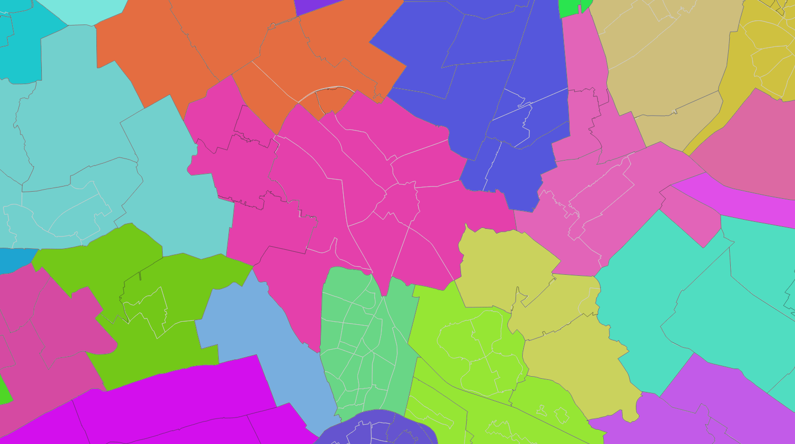 Hier zie je hoe de wijken en woonplaatsen samenhangen in en rond de gemeente Utrecht. Grenzen sluiten niet aan elkaar. Soms zijn er meerdere woonplaatsen per wijk. Soms zijn er meerdere wijken per woonplaats. Kortom: het is een hele klus! De wijken zijn ingekleurd naar gemeente en hebben een lichtgrijze kleur. De woonplaatsgrenzen zijn donkergrijs getekend.