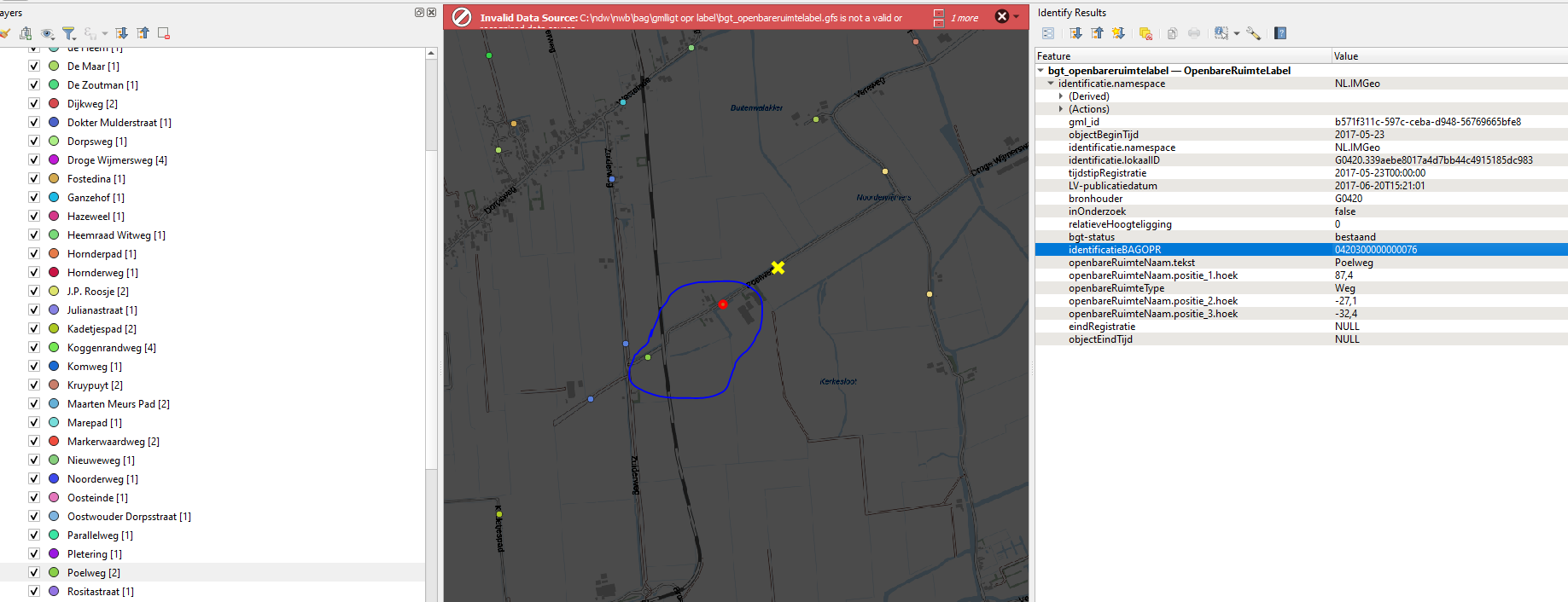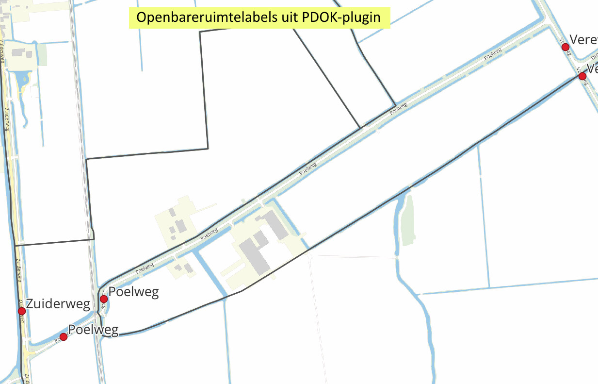Je gebruikt nu in QGIS de laag ‘Openbare Ruimte Label (ORL)’ van type ‘OGC API-Features’ uit de PDOK-plugin. Die laag laat maar één van die plaatsingspunten zien, en is dus niet geschikt voor je analyse.