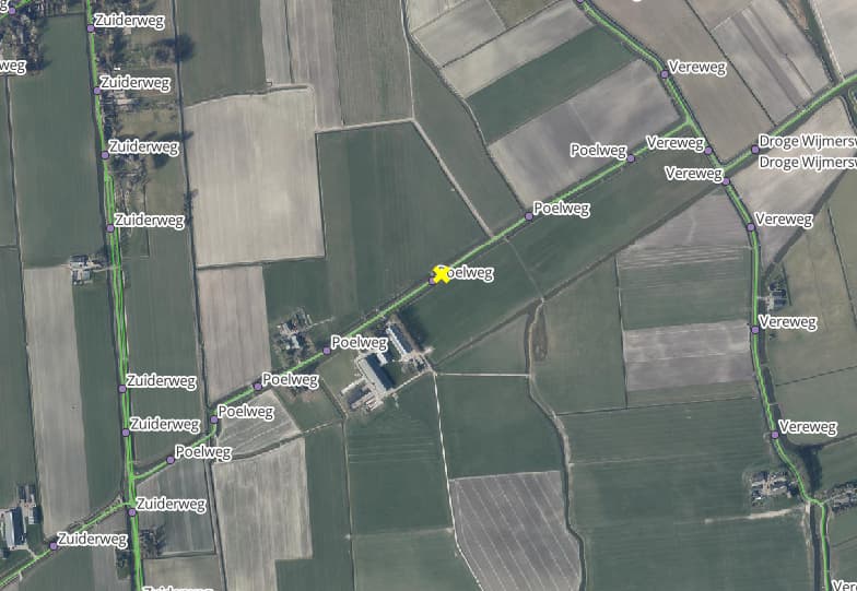 Hieronder het openbareruimtelabel van de Poelweg in BAG-woonplaats Medemblik (gedownload via de PDOK download viewer). Dit openbareruimtelabel heeft 6 plaatsingspunten.