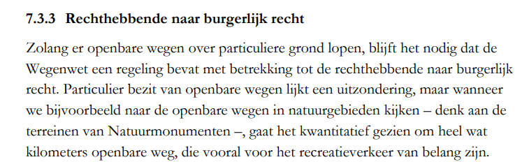 In de Memorie van Toelichting op de Wegenwet wordt de rol van particulier eigendom van openbare wegen op meerdere plekken toegelicht, maar onderstaande tekst van de Commissie van Advies inzake de Waterstaatswetgeving is 80 jaar nieuwer en wat makkelijker leesbaar