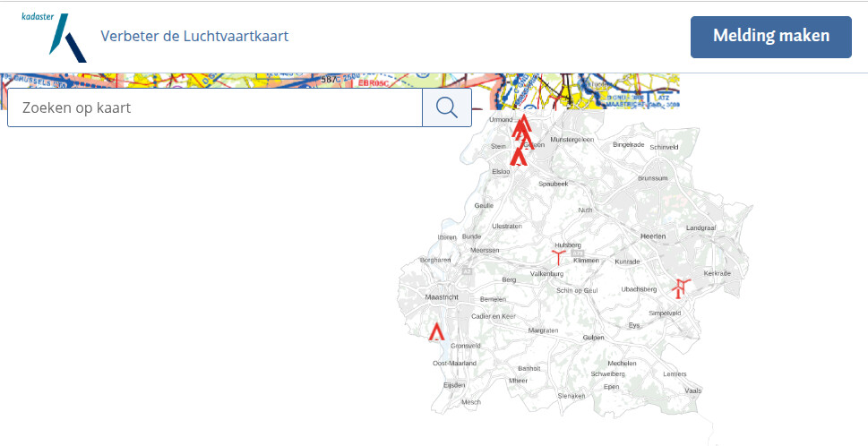 Nederland is alleen verantwoordelijk voor de kaartbladen die zichtbaar zijn in Verbeterdeluchtvaartkaart.nl. De missende delen in Limburg en Gelderland vallen onder de verantwoordelijkheid van onze buurlanden. Deze kaartbladen zijn niet beschikbaar voor publicatie in Verbeterdeluchtvaartkaart.nl. Voor deze gebieden wordt de BRT Achtergrondkaart (grijs) getoond.