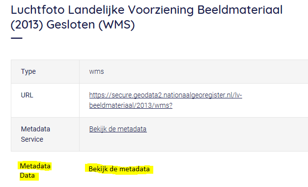 Op de pagina van de gesloten luchtfoto’s zie je wel een knop naar de metadata service records naar het NGR maar niet de metadata data.